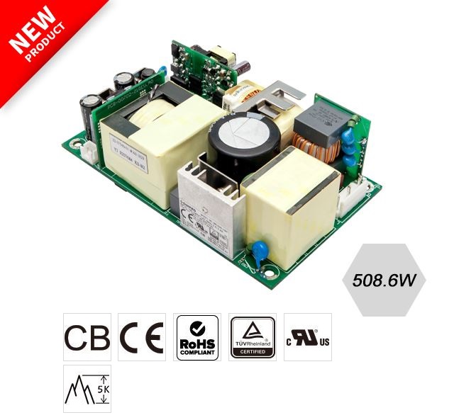 The MBU500 series is a family of open frame medical power supplies that are designed to offer 500W continuous output power with a single output of either 12v, 24v, 36v, or 48v (coming with a universal input of 90-264 Vac) at efficiencies up to 92%. The power modules can operate in an operating temperature range of -40 to +70°C with a 5000M altitude operational ability.